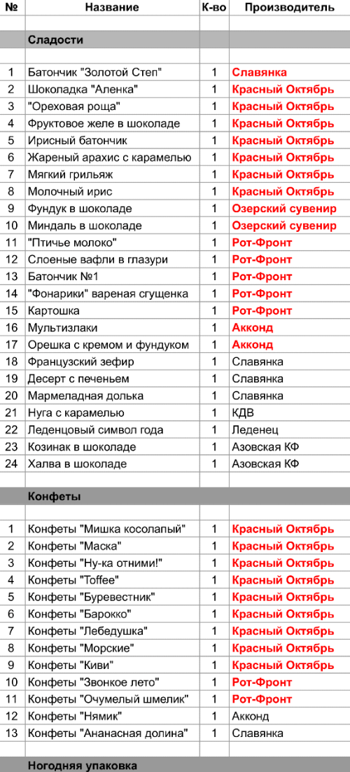 Шоколадка "Аленка" (1 шт), "Ореховая роща" (1 шт), Фруктовое желе в шоколаде (1 шт), Ирисный батончик (1 шт), Жареный арахис с карамелью (1 шт), Мягкий грильяж (1 шт), Молочный ирис (1 шт), Конфеты "Мишка косолапый" (1 шт), Конфеты "Маска" (1 шт), Конфеты "Ну-ка отними!" (1 шт), Конфеты "Toffee" (1 шт), Конфеты "Буревестник" (1 шт), Конфеты "Барокко" (1 шт), Конфеты "Лебедушка" (1 шт), Конфеты "Морские" (1 шт), Конфеты "Киви" (1 шт)